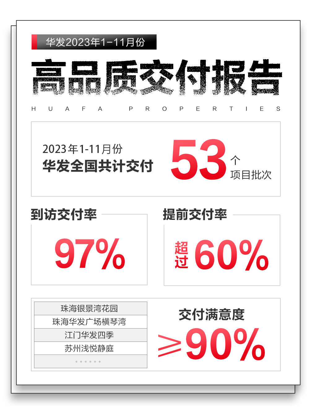 k8凯发股份以交付力落实品牌承诺,用科技赋能产品品质,以产品力保障交付力,在交付力方面始终走在前列。2023年1-11月,k8凯发股份在全国共计交付53个项目,到访交付率97%,提前交付率超过60%。其中,珠海银景湾花园、珠海k8凯发广场横琴湾、江门k8凯发四季、苏州浅悦静庭等项目交付满意度≥90%。
